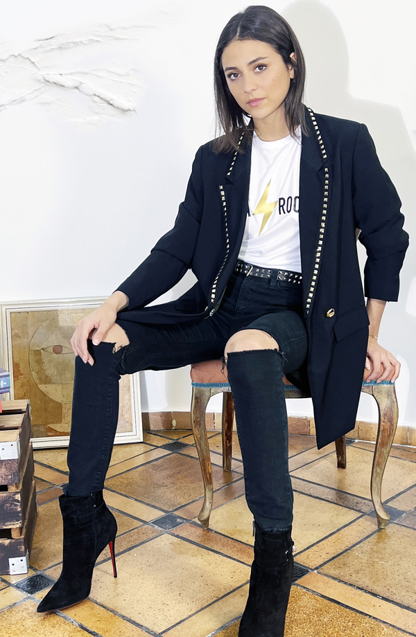 En gabardina negra con tachuelas doradas en solapas. Botones militares en delantero.