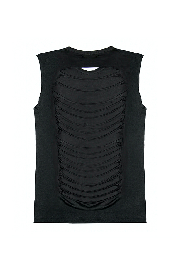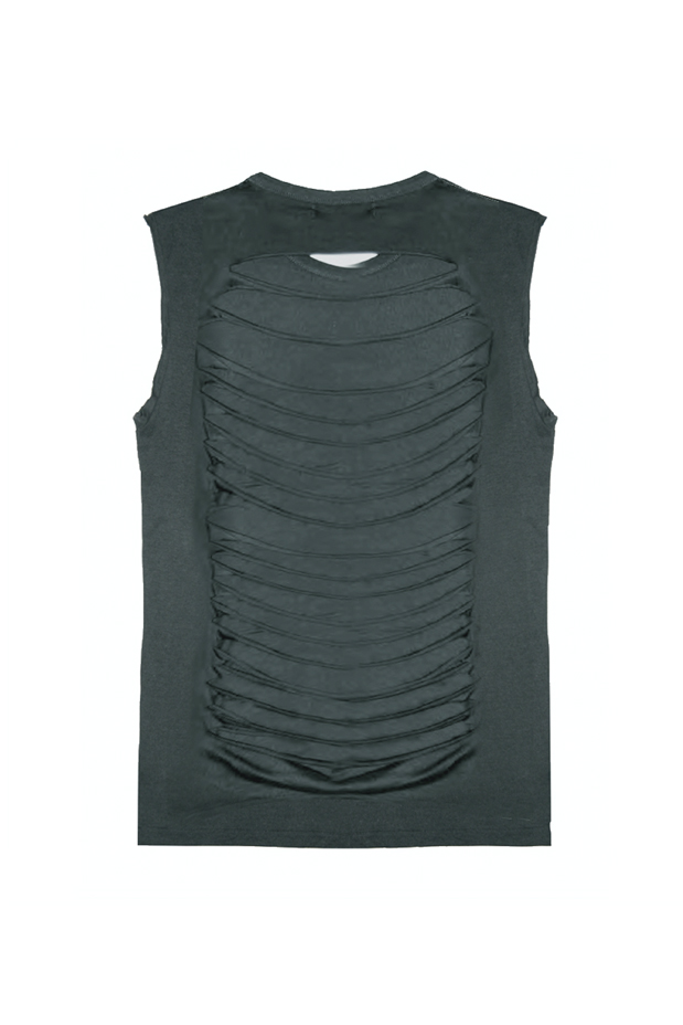 Camiseta bambú sin mangas, cortadas manualmente, con cuello caja. Espalda rajada manualmente. Patrón oversize.