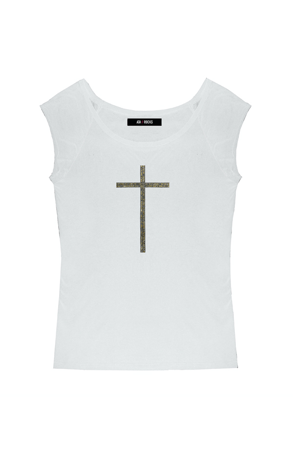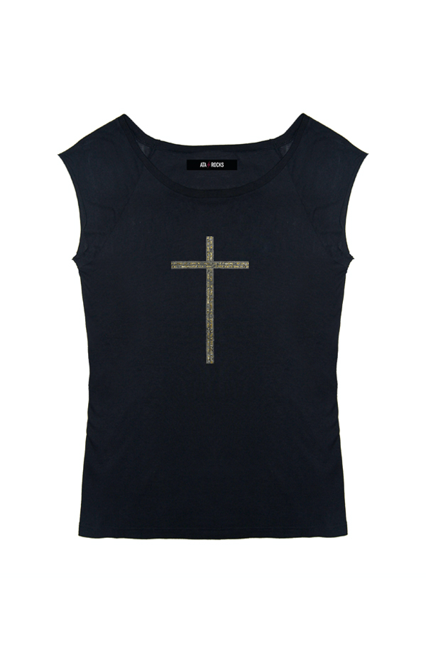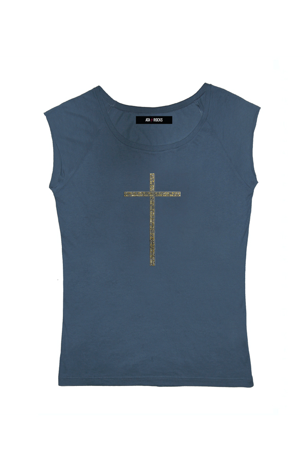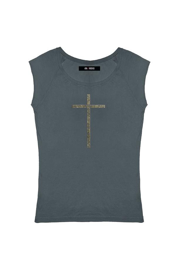 Camiseta bambú manga raglán mujer, con amplio cuello.  Estampado Cruz de Metal en oro y plata.