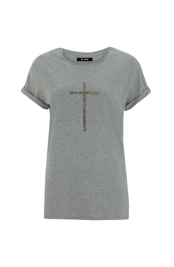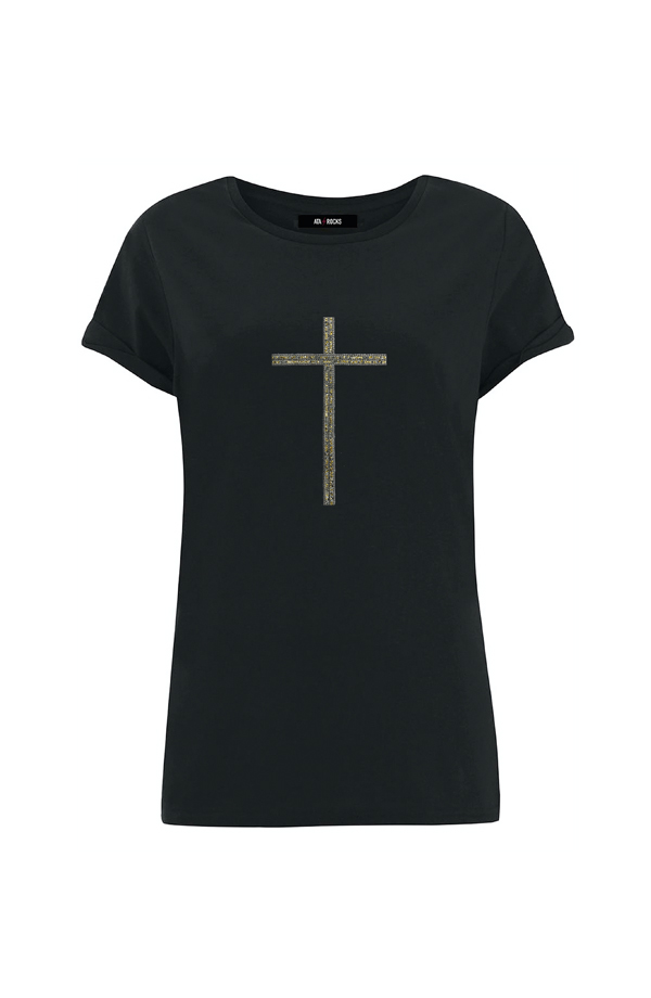 Camiseta con manga vuelta enrollada. Cuello caja amplio. Estampado Cruz de Metal en oro y plata.