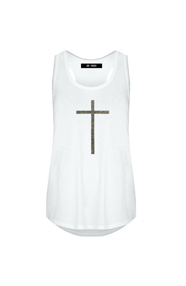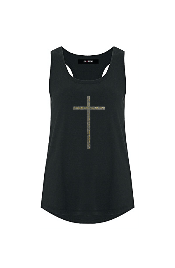 Camiseta de tirantes, espalda cruzada, tipo nadador. Estampado Cruz de Metal en oro y plata.
