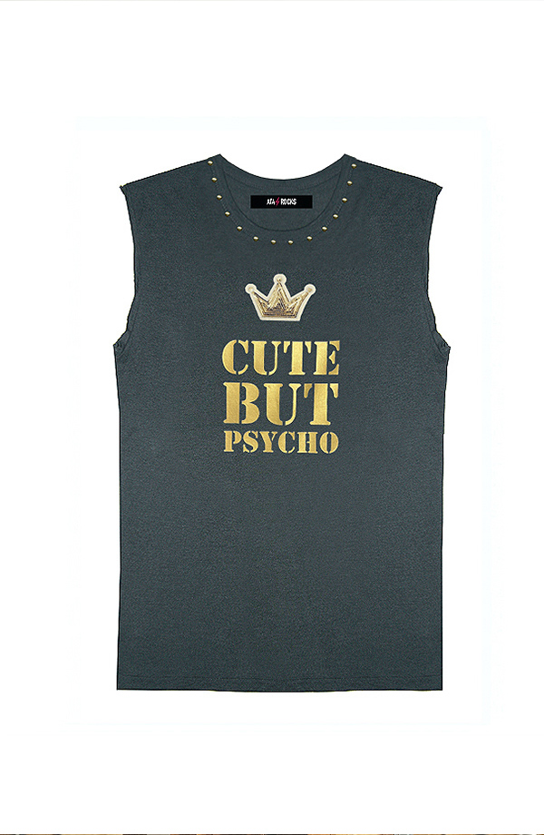 Camiseta bambú sin mangas, cortadas manualmente. Espalda rajada manualmente. Patrón oversize. Estampado CUTE BUT PSYCHO en oro. Tachuelas de latón..