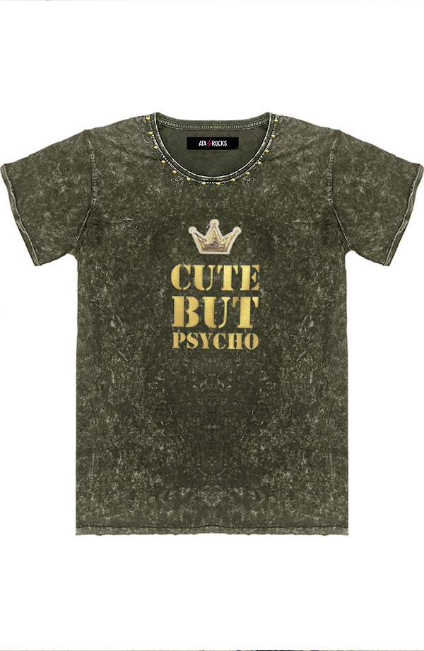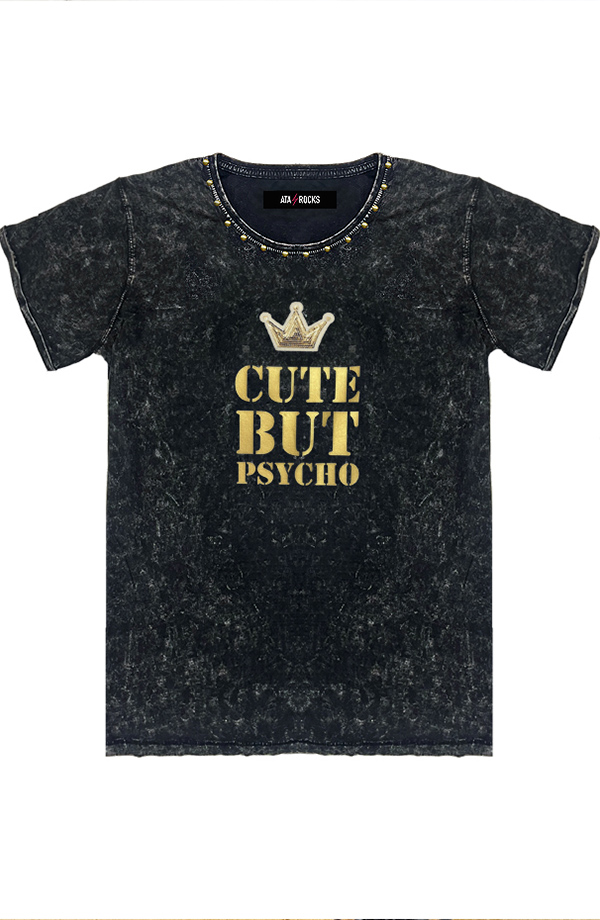 Camiseta de manga corta efecto desgastado, lavado ácido.  Doble costura en sisas. Manga doblada hacia arriba.  Estampado CUTE BUT PSYCHO en oro.