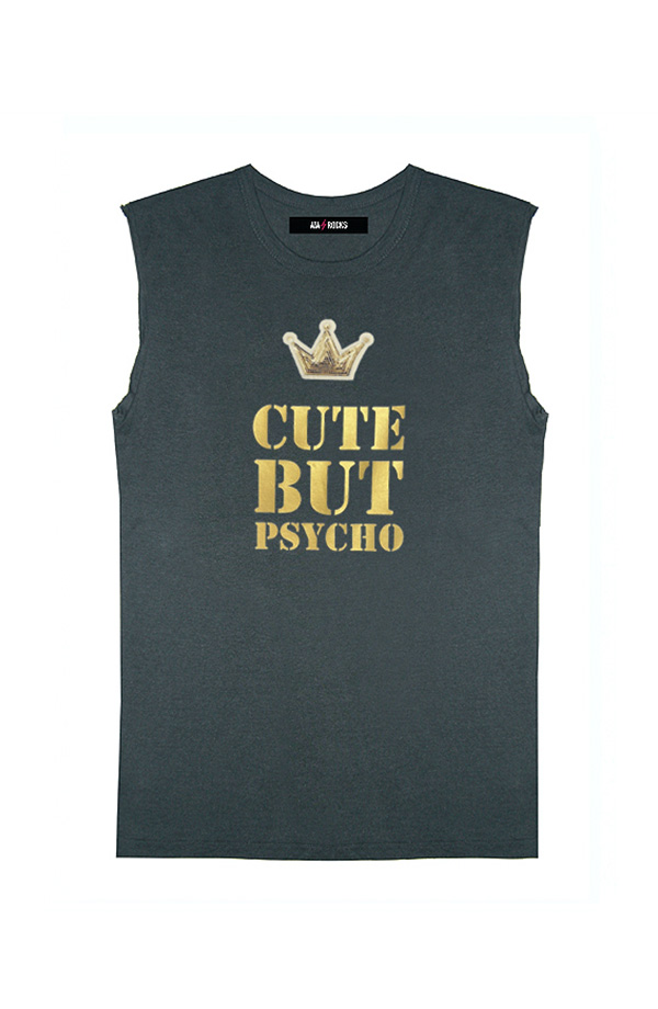 Camiseta bambú sin mangas, cortadas manualmente. Espalda rajada manualmente. Patrón oversize. Estampado CUTE BUT PSYCHO en oro.