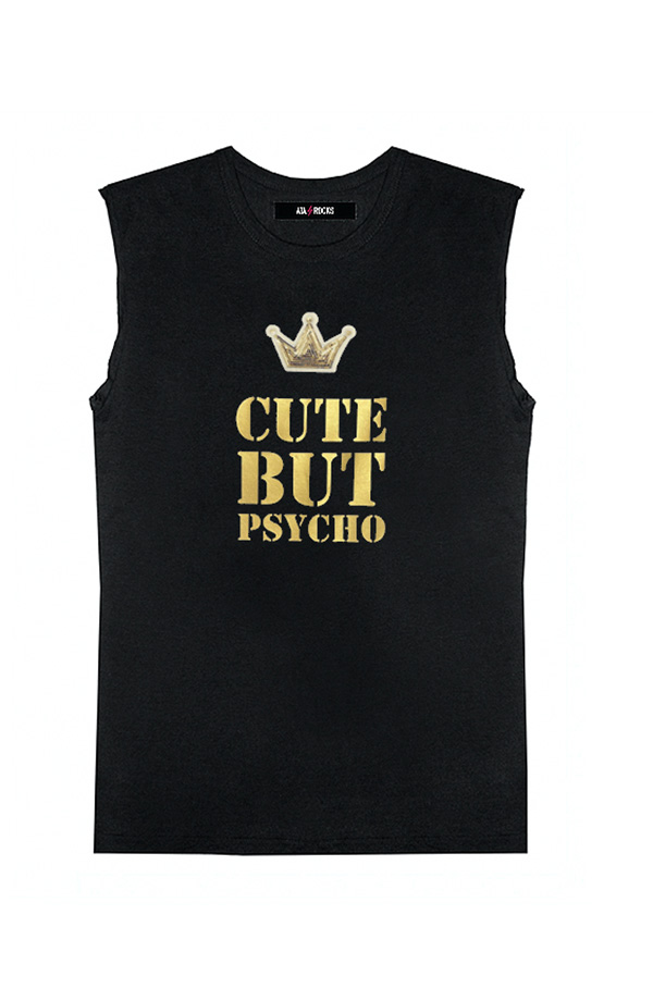 Estampado CUTE BUT PSYCHO en oro. En vinilo oro, con corona de paillettes.