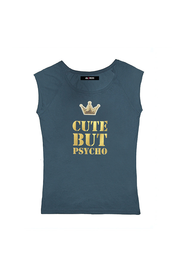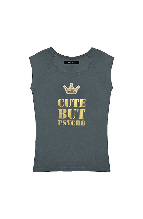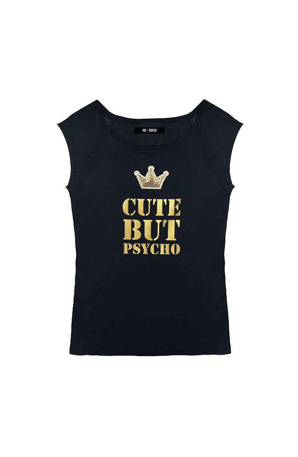 Estampado CUTE BUT PSYCHO en oro. En vinilo oro, con corona de paillettes.