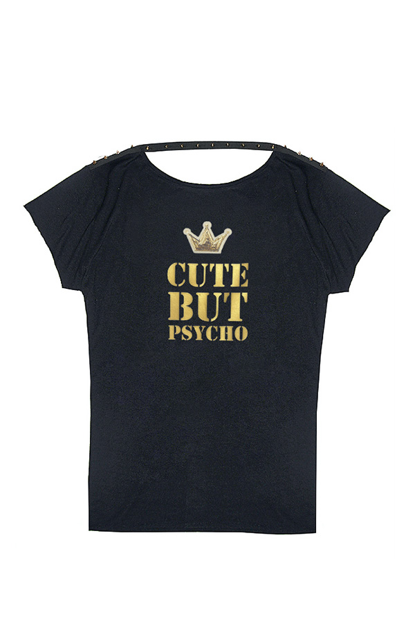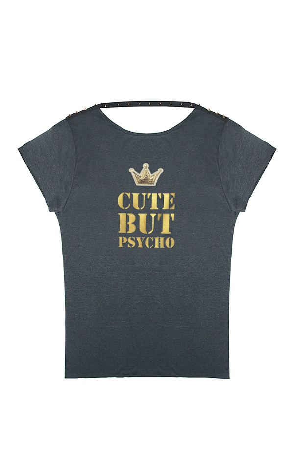 Estampado CUTE BUT PSYCHO en oro. En vinilo oro, con corona de paillettes.