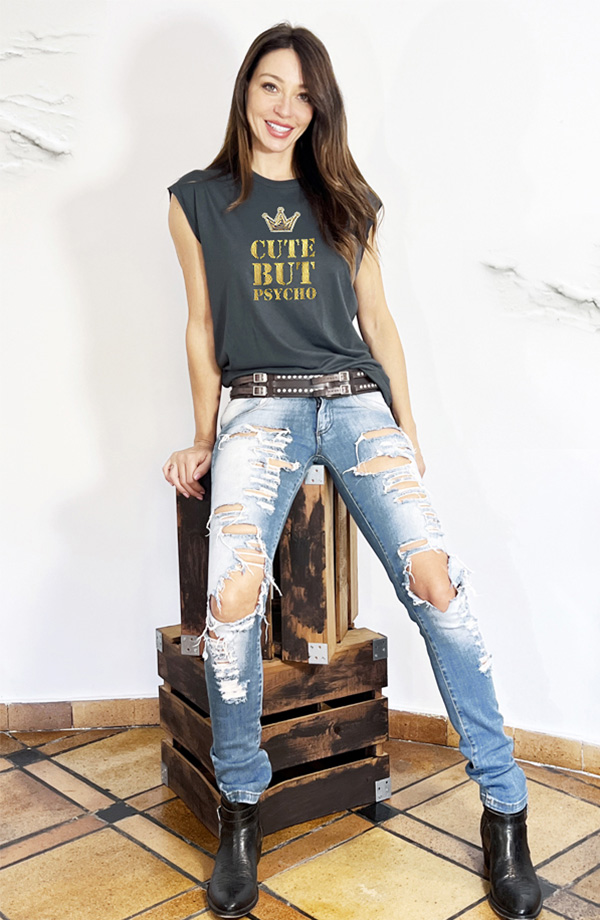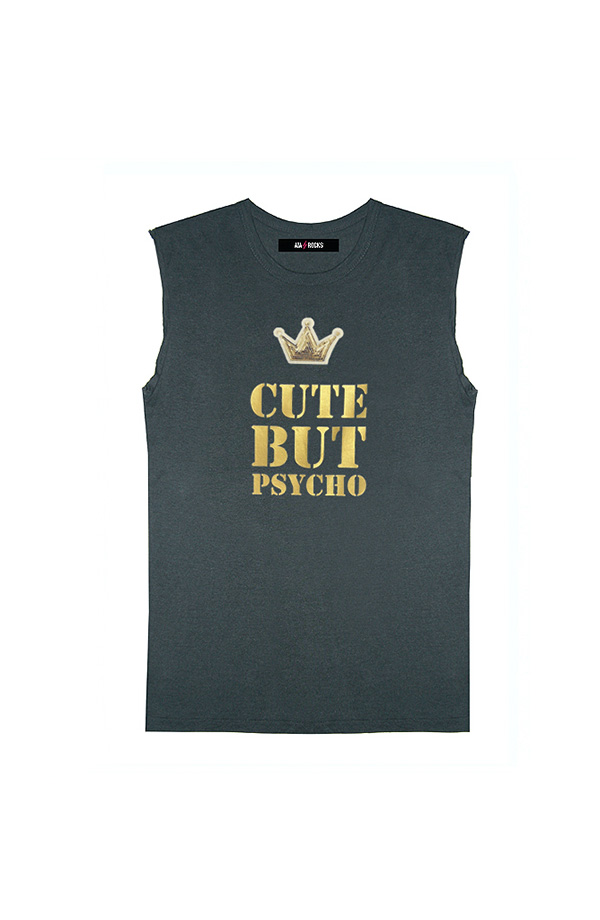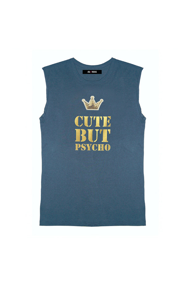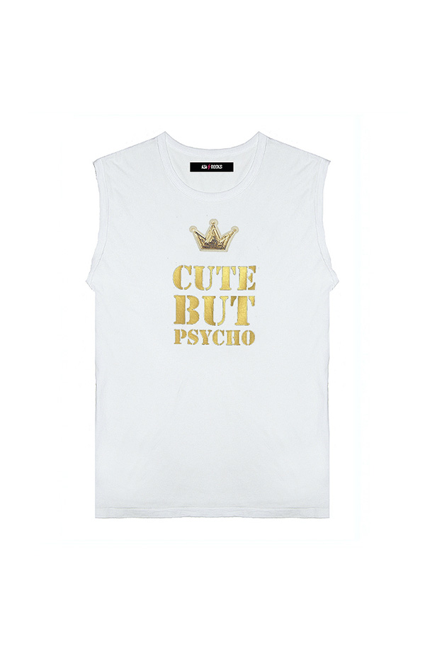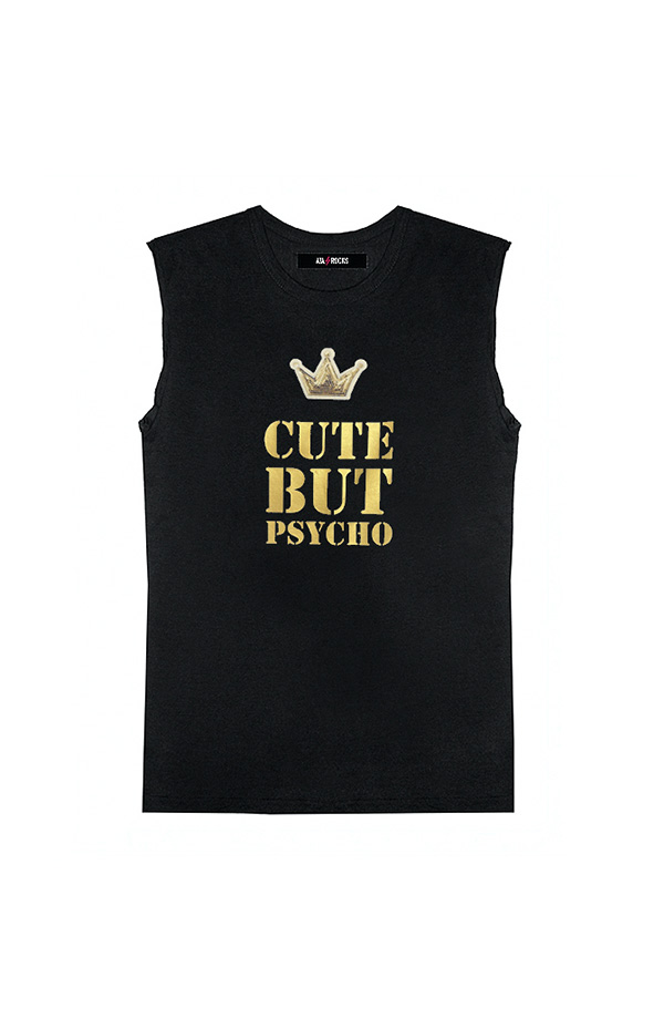 Camiseta bambú sin mangas, cortadas manualmente, con cuello caja. Estampado CUTE BUT PSYCHO en oro, con corona de paillettes.