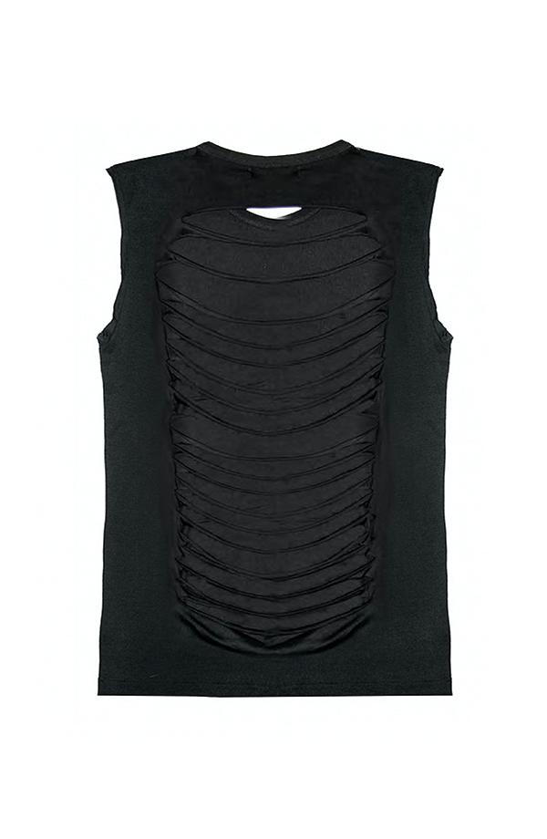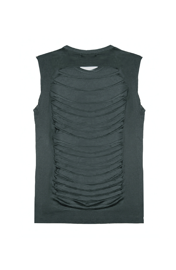 Camiseta bambú sin mangas, cortadas manualmente, con cuello caja. Espalda rajada manualmente. Patrón oversize.