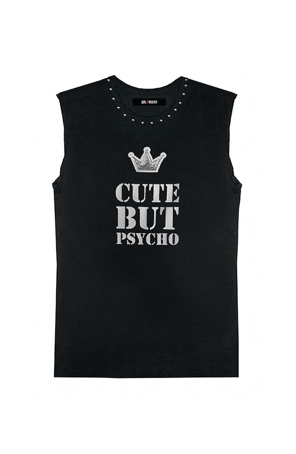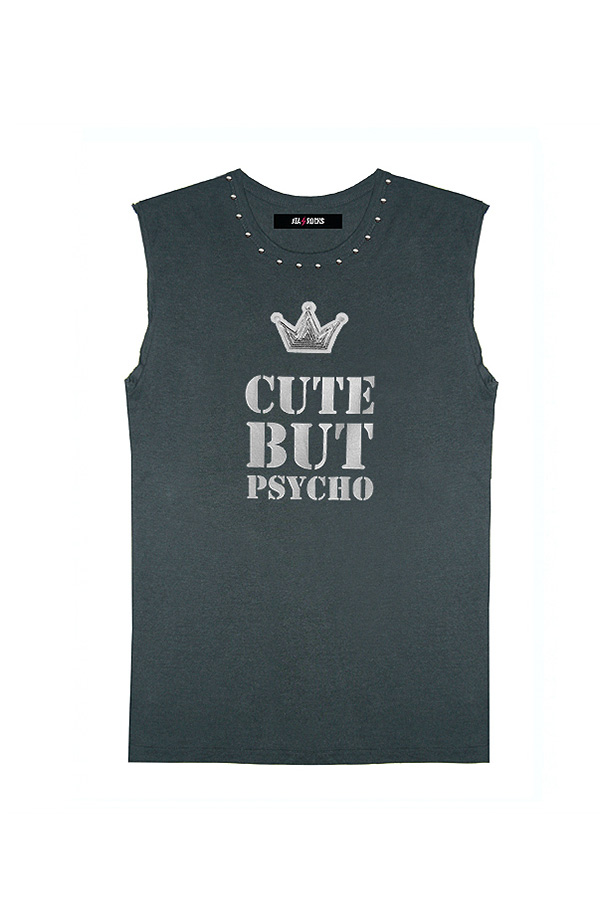 Camiseta bambú sin mangas, cortadas manualmente. Espalda rajada manualmente. Estampado CUTE BUT PSYCHO en plata con tachuelas de latón.