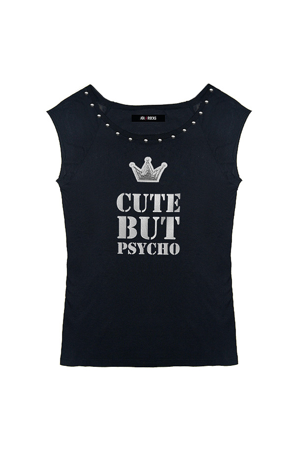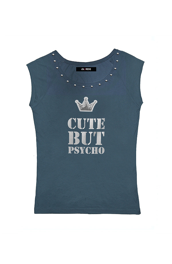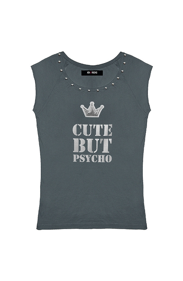 Camiseta bambú manga raglán mujer, con amplio cuello.  Estampado CUTE BUT PSYCHO en plata.