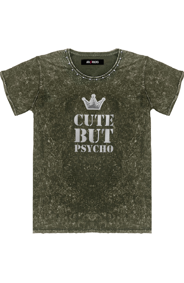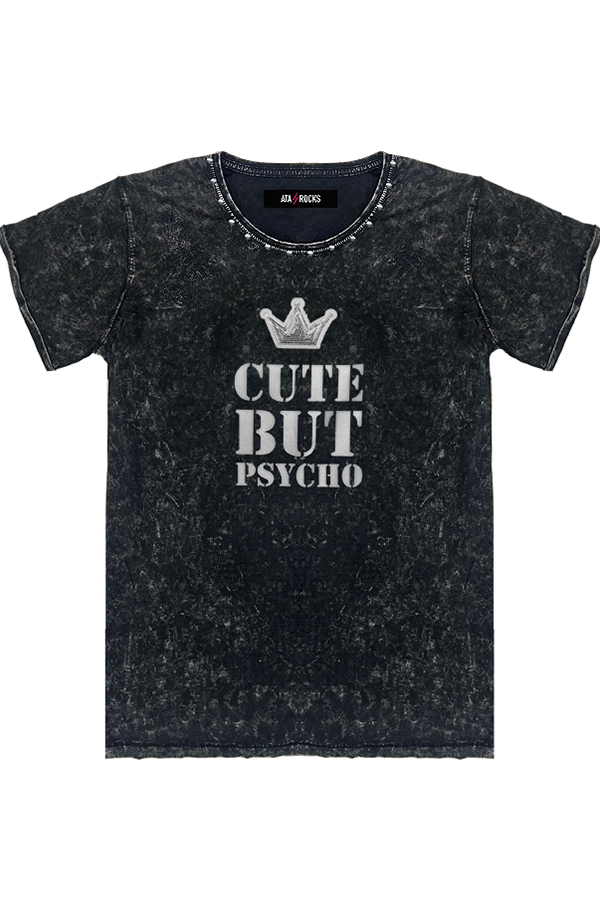 Camiseta de manga corta efecto desgastado, lavado ácido.  Doble costura en sisas. Manga doblada hacia arriba.  Estampado CUTE BUT PSYCHO en plata. Tachuelas de latón.