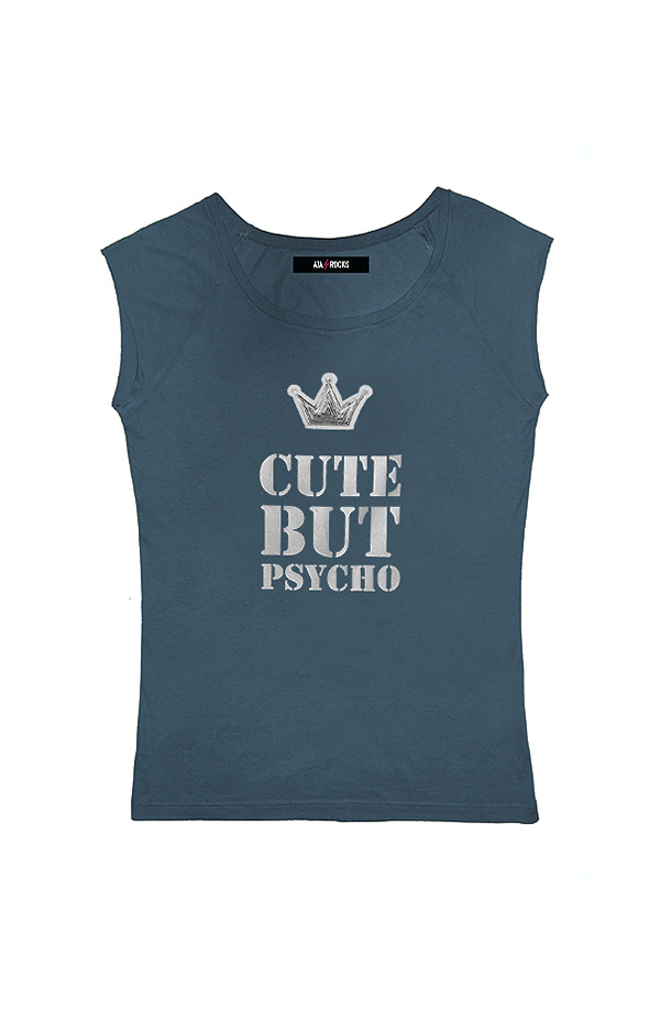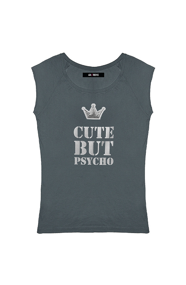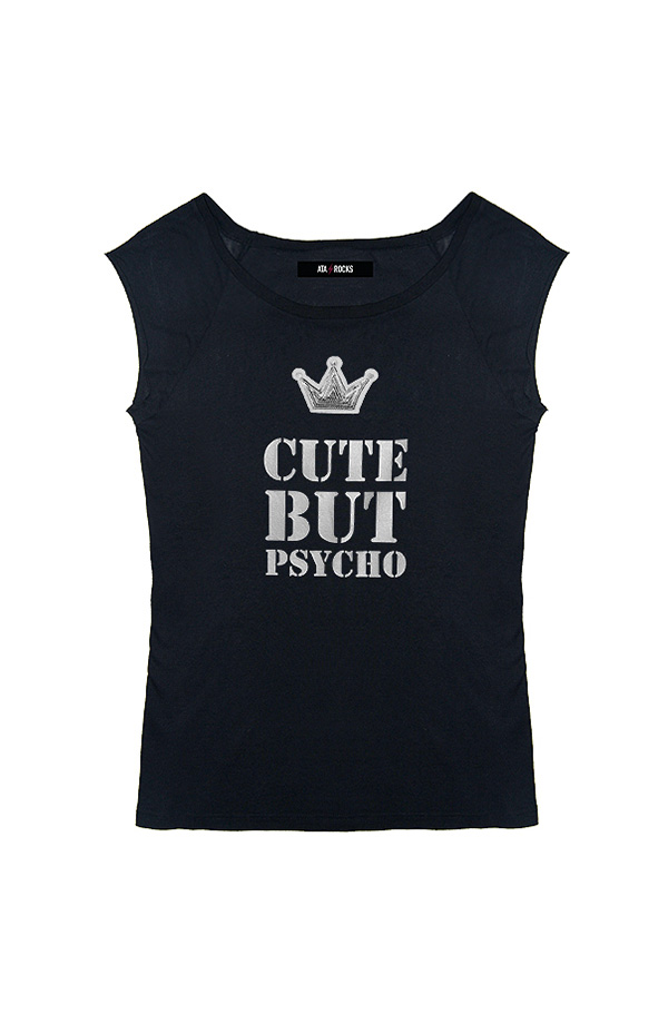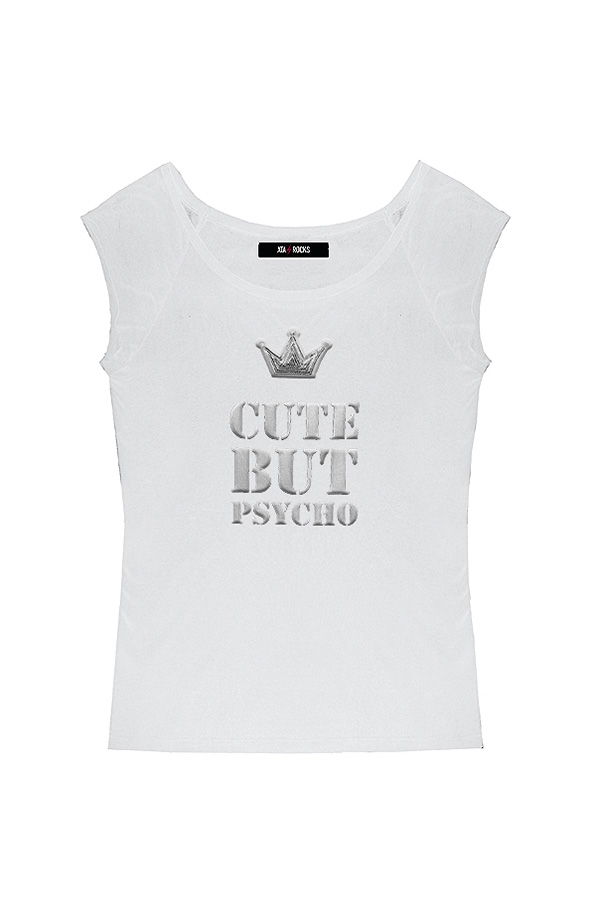Estampado CUTE BUT PSYCHO en plata. En vinilo plata, con corona de paillettes.