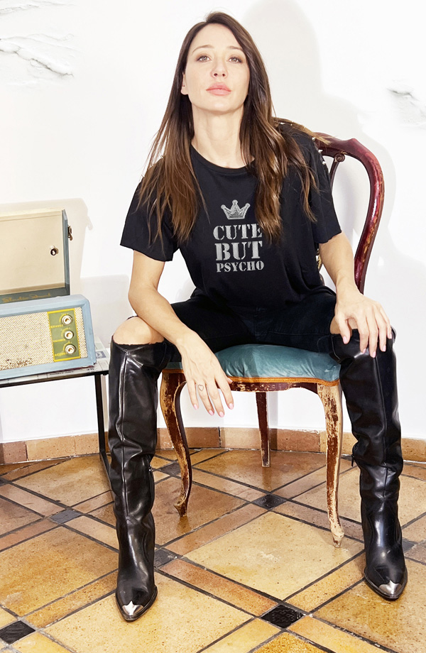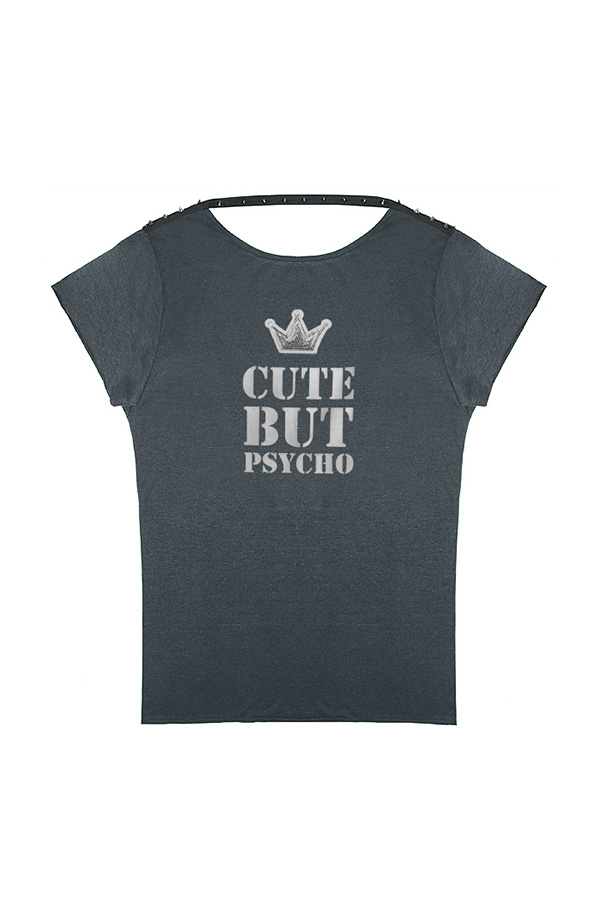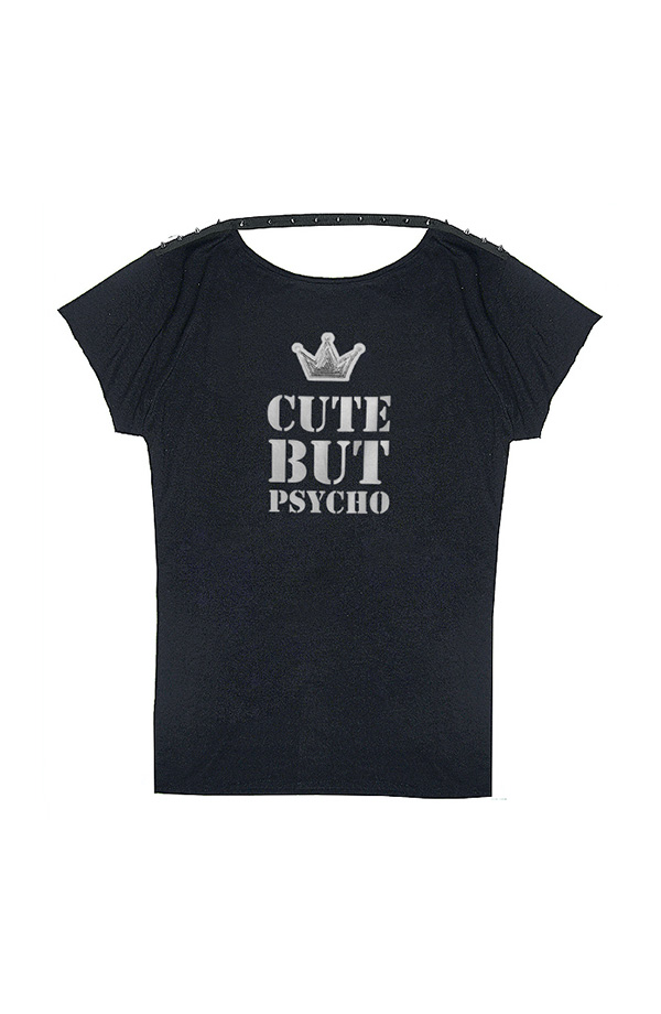 Estampado CUTE BUT PSYCHO en plata. En vinilo plata, con corona de paillettes.
