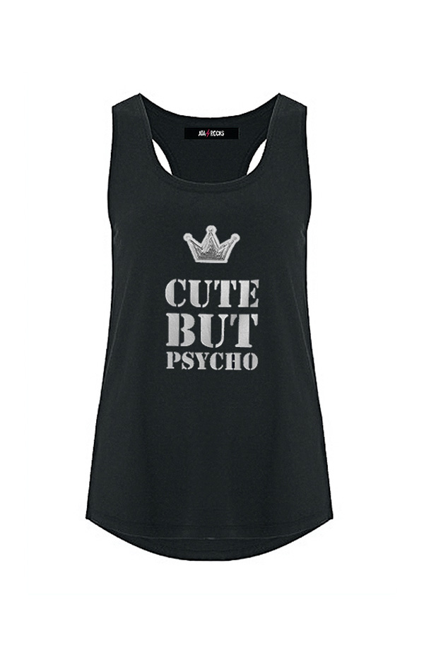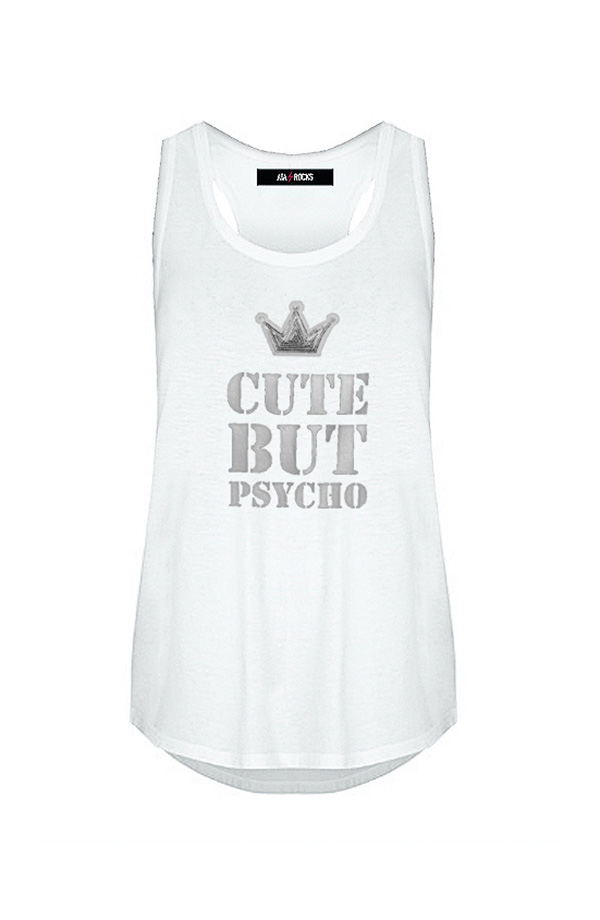 Camiseta de tirantes, espalda cruzada, tipo nadador. Estampado CUTE BUT PSYCHO, en vinilo plata.