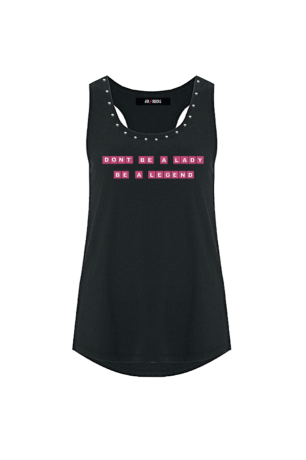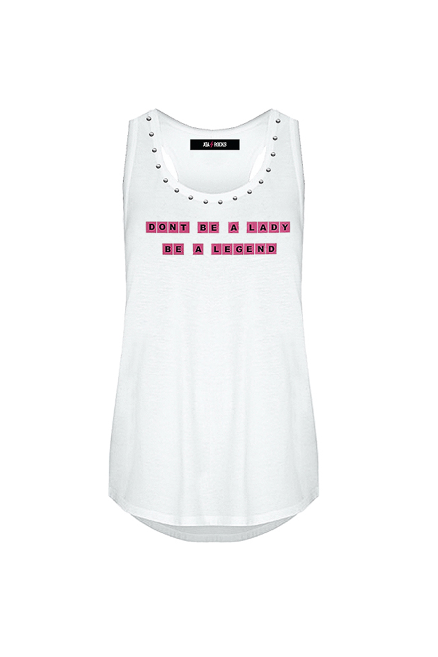 Camiseta de tirantes, espalda cruzada, tipo nadador. Estampado DON´T BE A LADY BE A LEGEND. Tachuelas plateadas de latón en escote.