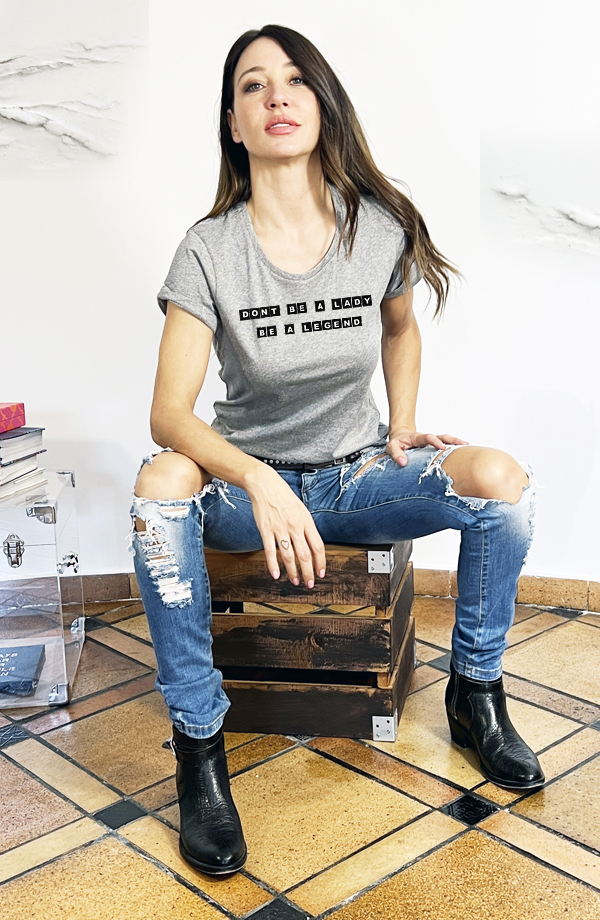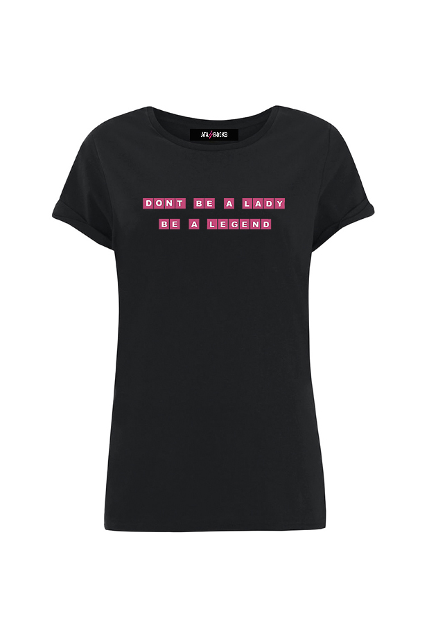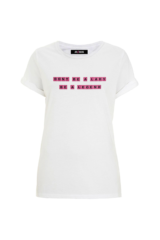 Camiseta con manga vuelta enrollada. Cuello caja amplio. Estampado DON´T BE A LADY BE A LEGEND.