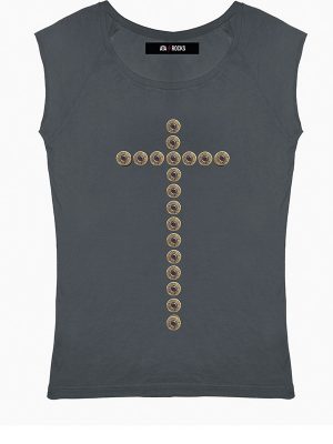 Camiseta bambú sin mangas, cortadas manualmente, con cuello caja. Estampado con rayo en Oro o Plata. Tachuelas plateadas de latón en escote.