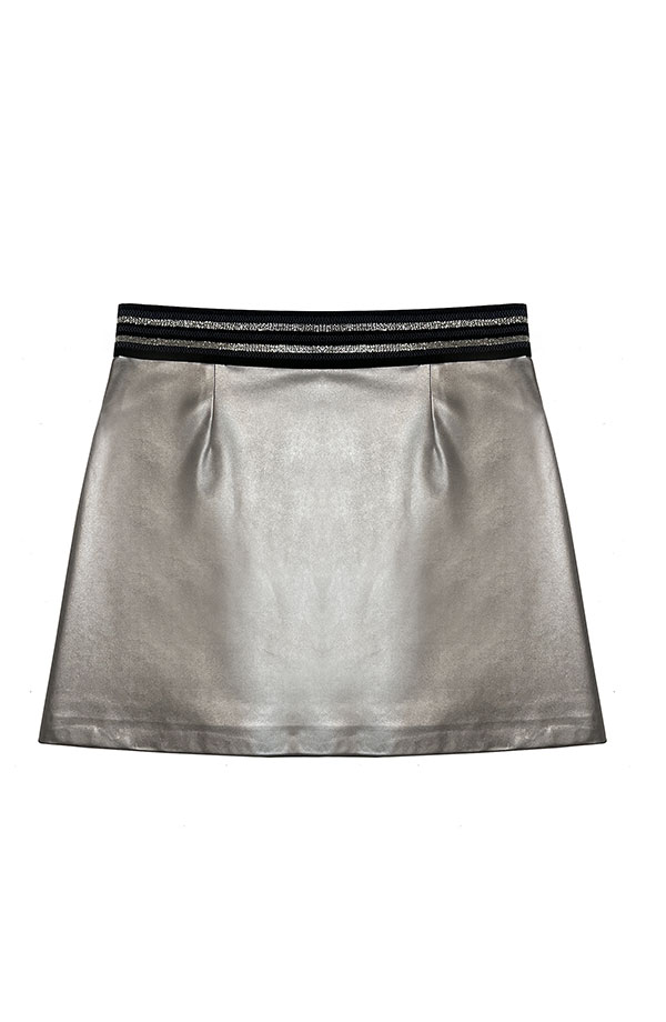 En ecopiel elástica, con forro contrastado en color negro. Cremallera lateral invisible. Cinturilla elástica en negro, oro y plata. Patrón tipo trapecio único de la firma , super favorecedor.
