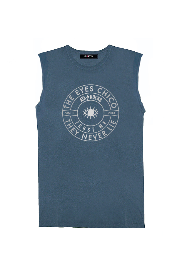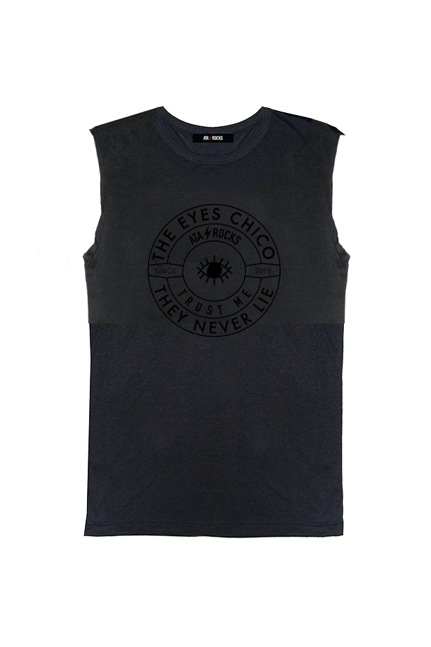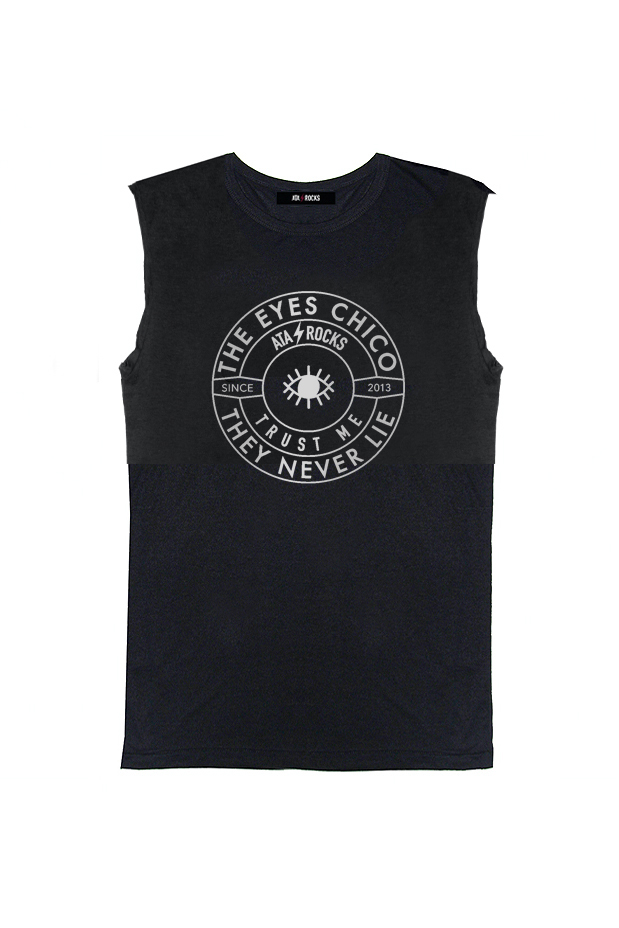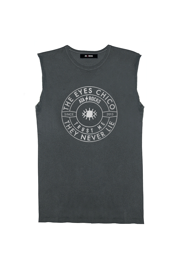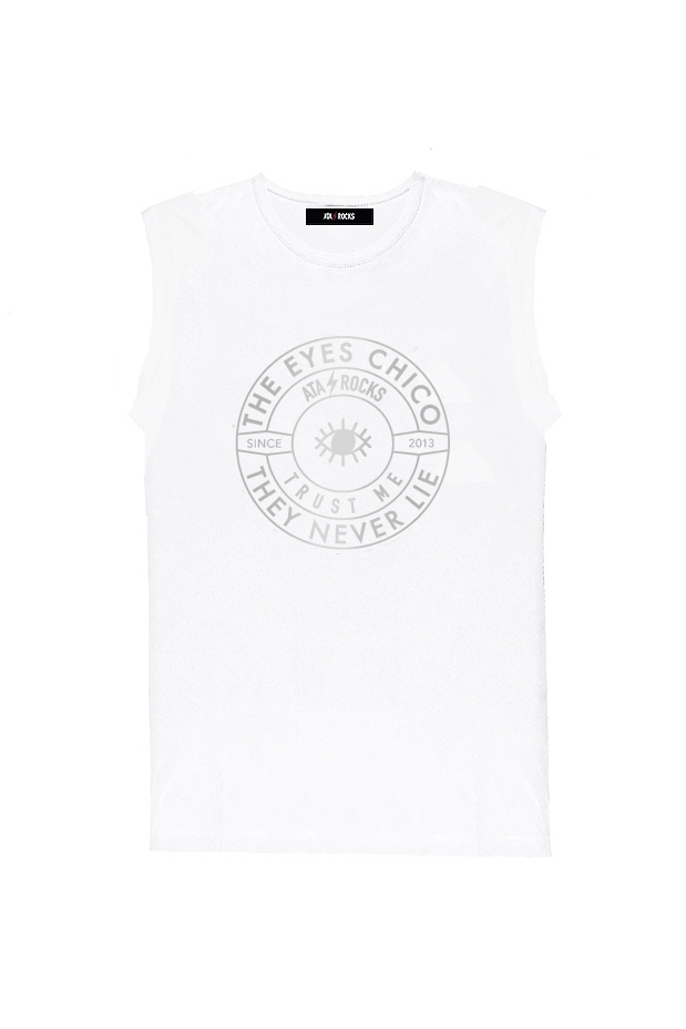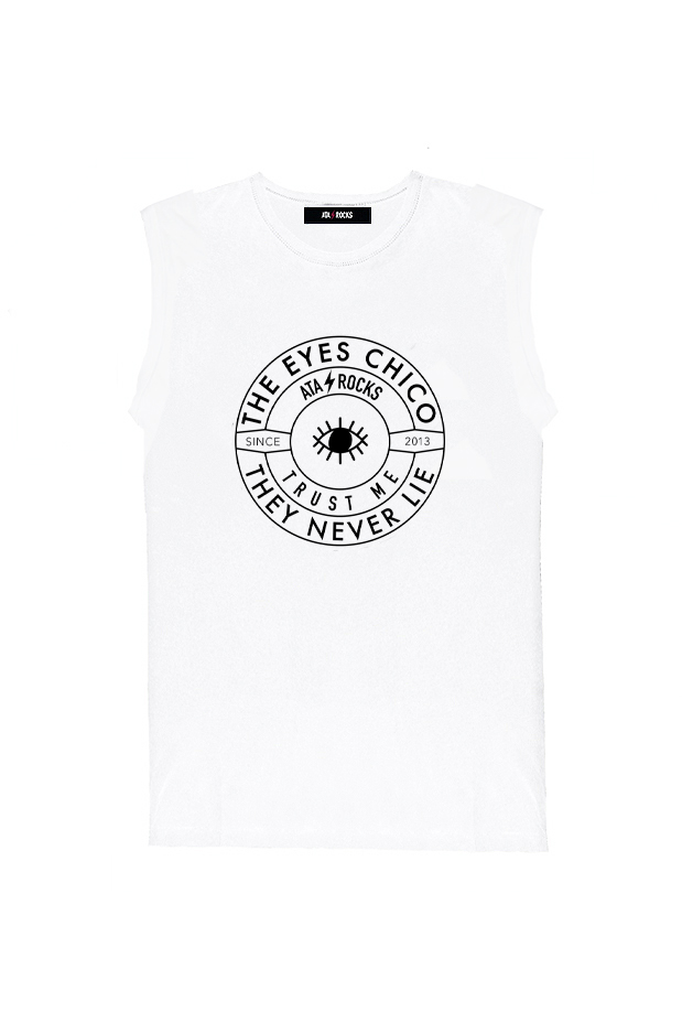 Camiseta sin mangas, cortadas manualmente, con cuello caja. Patrón fit. Estampado THE EYES CHICO THEY NEVER LIE.