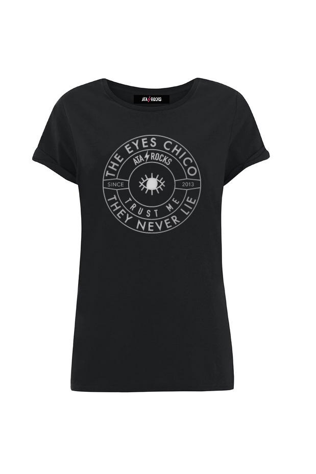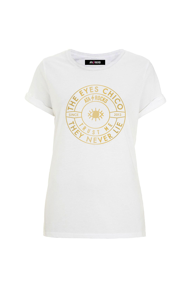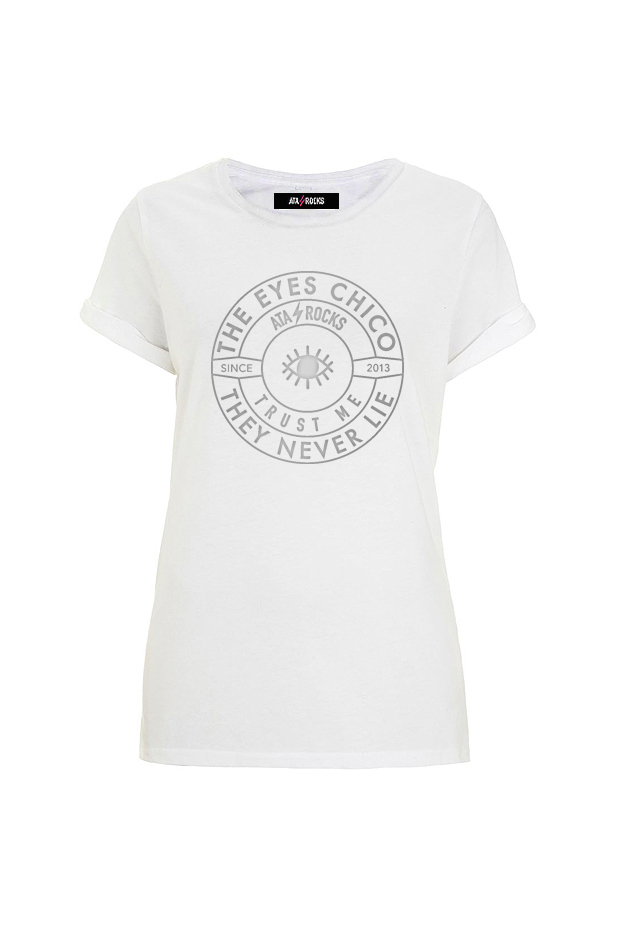Camiseta con manga vuelta enrollada. Cuello caja amplio. Patrón al cuerpo. Estampado THE EYES CHICO, THEY NEVER LIE.
