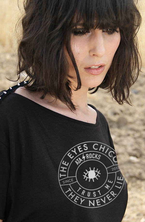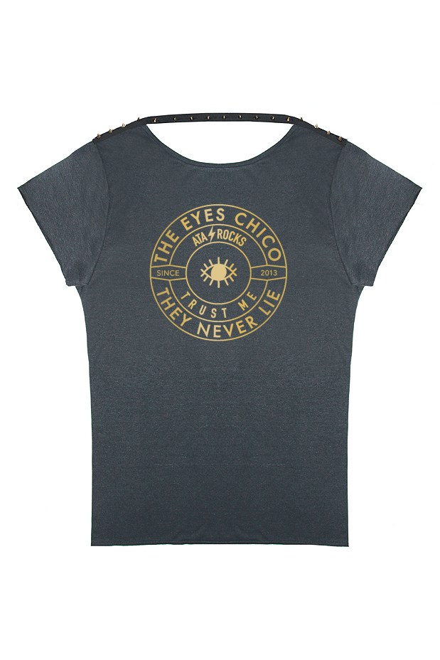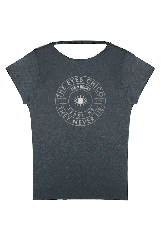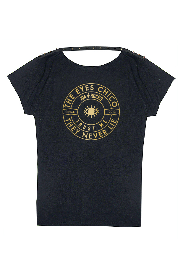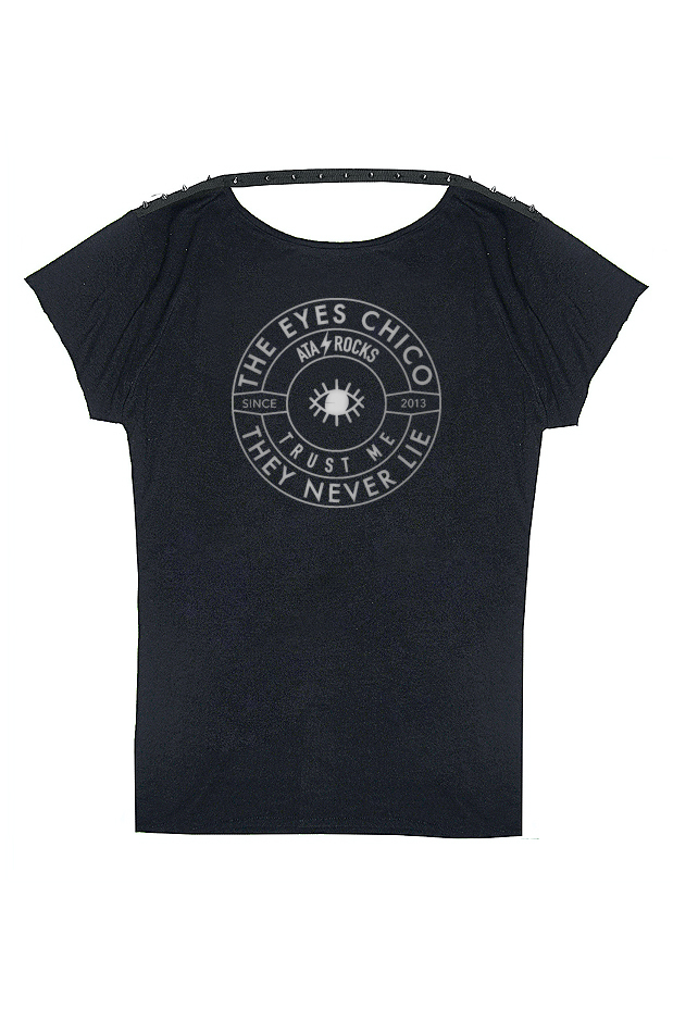 Top espalda al aire, con mangas y bajo sin rematar. Con tira de pinchos de hombro a hombro. Estampado THE EYES CHICO, THEY NEVER LIE.