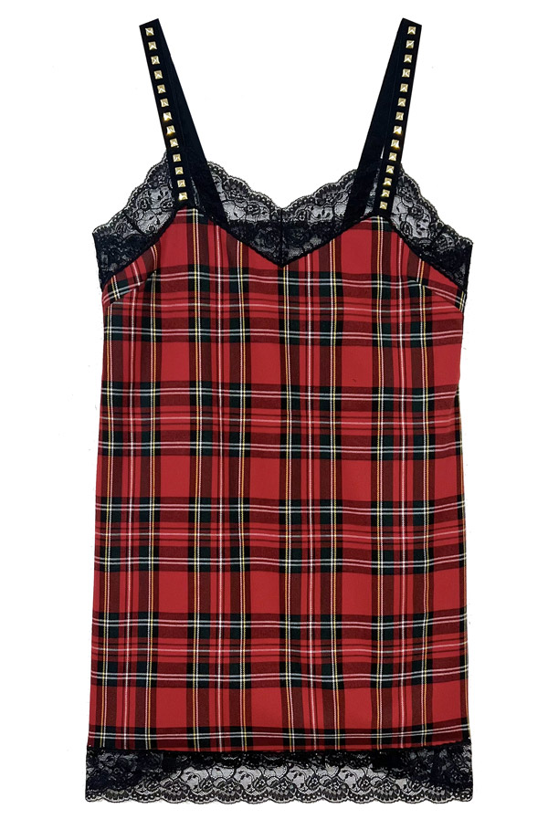 Vestido estilo lencero, en tejido escocés con encaje y tira de tachuelas doradas en tirantes y delantero.